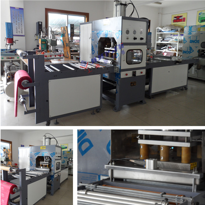 4. 配合高周波熔接同步送料/拉料,控制準確,速度可調(diào),大工作壓力35T。