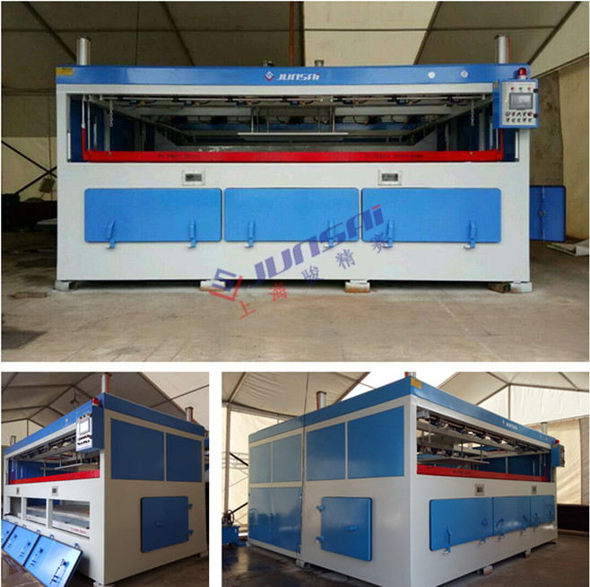 1、 苗床吸塑機(jī)設(shè)備由人工上料---雙爐加熱---防垂--吹泡--成型--冷卻--反吹氣脫膜下模臺(tái)模具下降--壓料框上升--人工取件9個(gè)工位組成。
