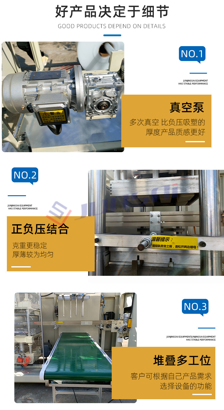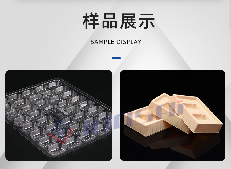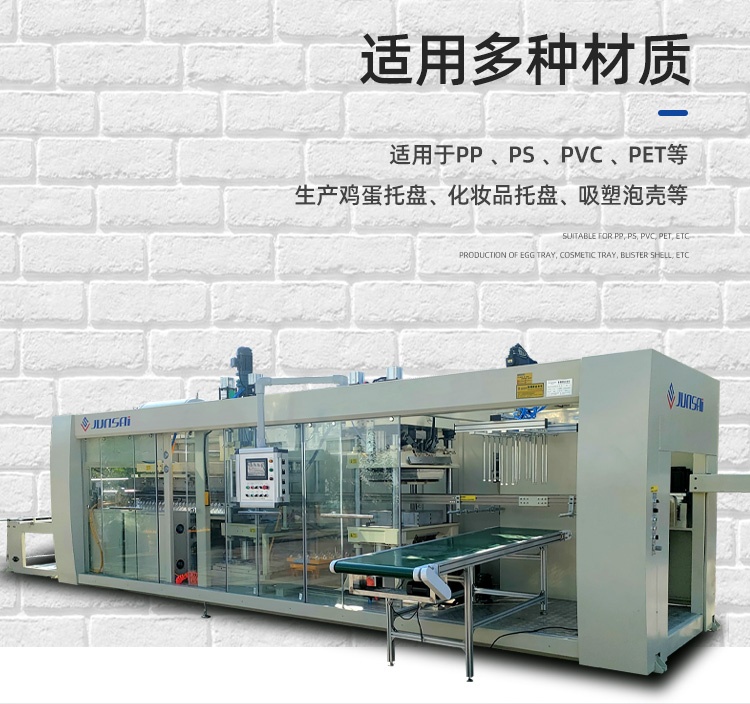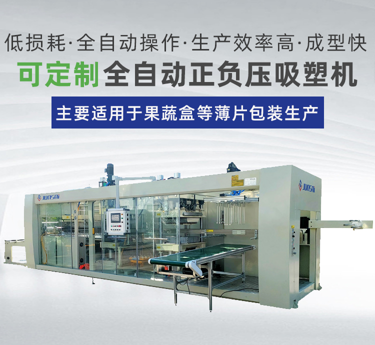 這臺全自動正負壓吸塑機適用于PS、PVC、PET、PP等塑料原材的成形,可以用來生產各種盒、碟、碗、電子托盤、杯蓋等塑料容器和包裝產品,如市面上常見的水果盒、糕點盒、保鮮盒、電子中轉托盤、玩具包裝等。